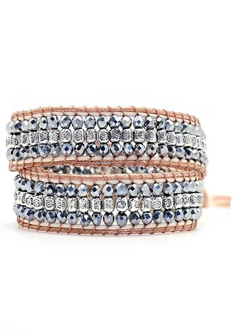 Accessorize your wrist with this beautiful Skyline Double Wrap beaded bracelet by 7 LUXE X Katie Soleil . This beautiful beaded Wrap Around Bracelet is designed with a variety of glass beads and stone beads secured with cotton cords and finished with signature secure button loop closure. Wrap this bracelet two times around your wrist or stack it up.