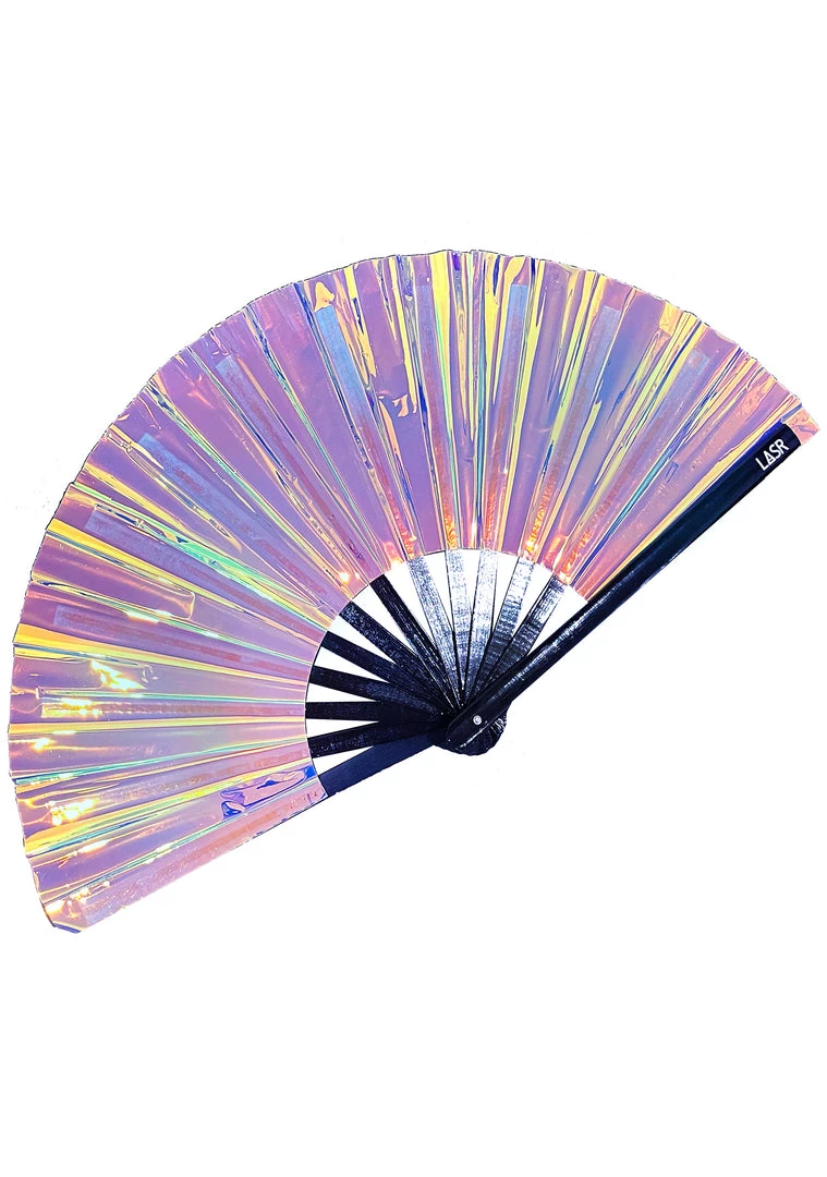 Make a thunderous statement and shock them while carrying the Electric Storm Iridescent Fluid Rave Fan from LASR. These electrifying festival rave accessory fans feature a shocking clear iridescent fabric that reflects and refracts multiple bright hues as it catches the light. Black-colored ribs and a solid rivet allow it to open and close in a flash. Lightning has nothing on your glow hunty.