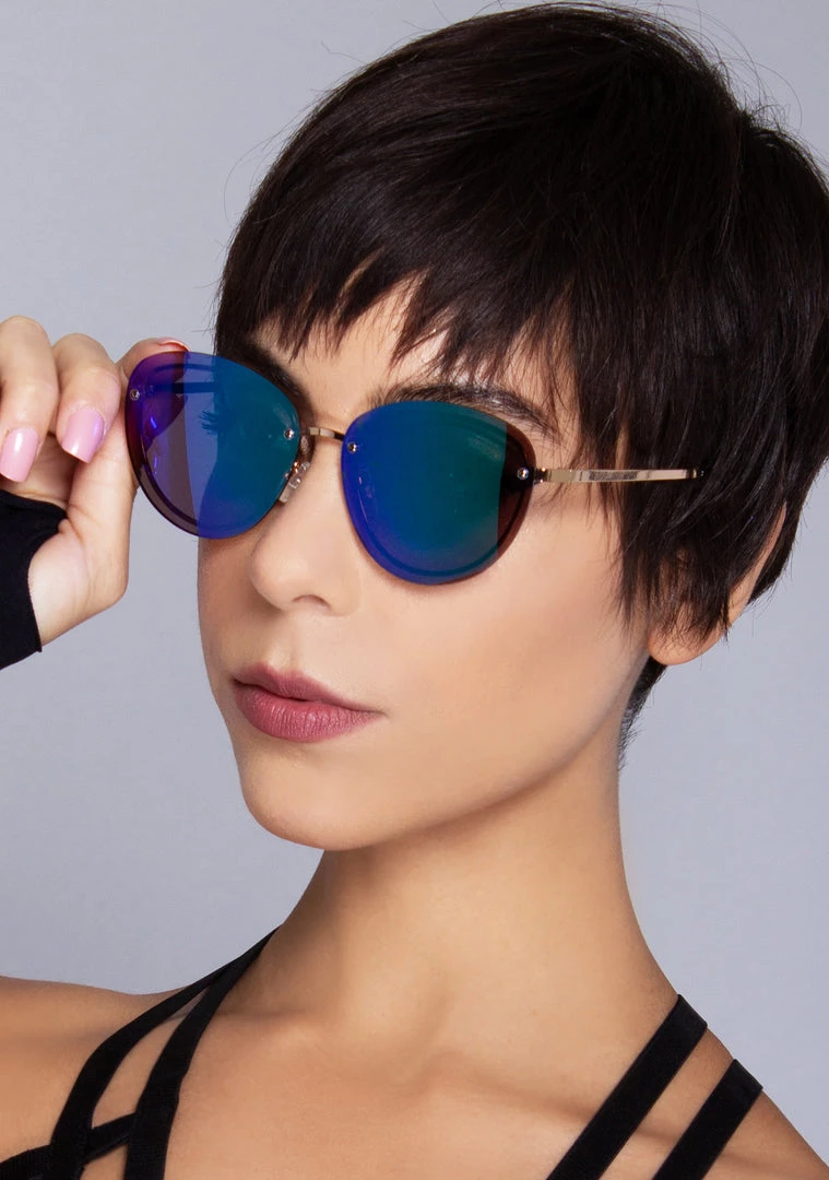 Look like the ultimate supernova babe in the LASR Hyperspace Reflective Sunglasses. These cosmic sunnies feature a super lightweight gold metal inner frame layered with colored mirror cat-eye shaped lens and comfy nose pads for longtime wear. You’ll take ‘em to other dimensions with these stellar festival sunglasses.