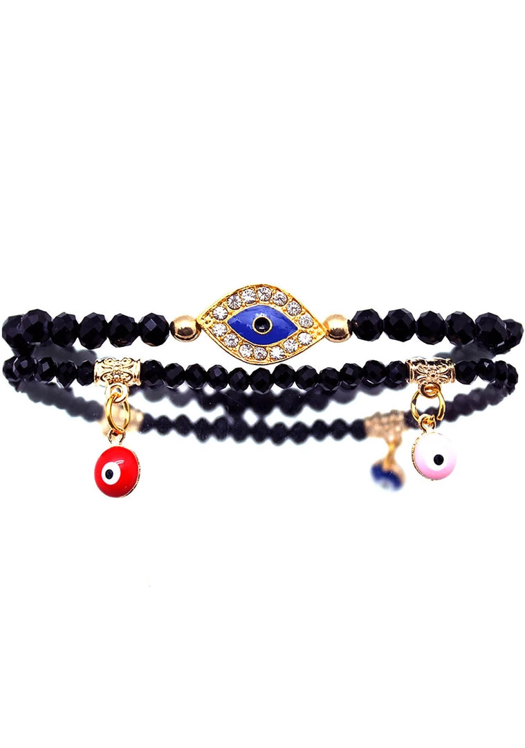 Protect yourself against negative energy and bad vibes with this beautiful Crystal Evil Eye Beaded Bracelet by LASR. This Punk Bracelets set of two features a yellow gold plated evil eye symbol embedded with Swarovski crystals, dangling evil eye charms, and polished fire beaded stones.