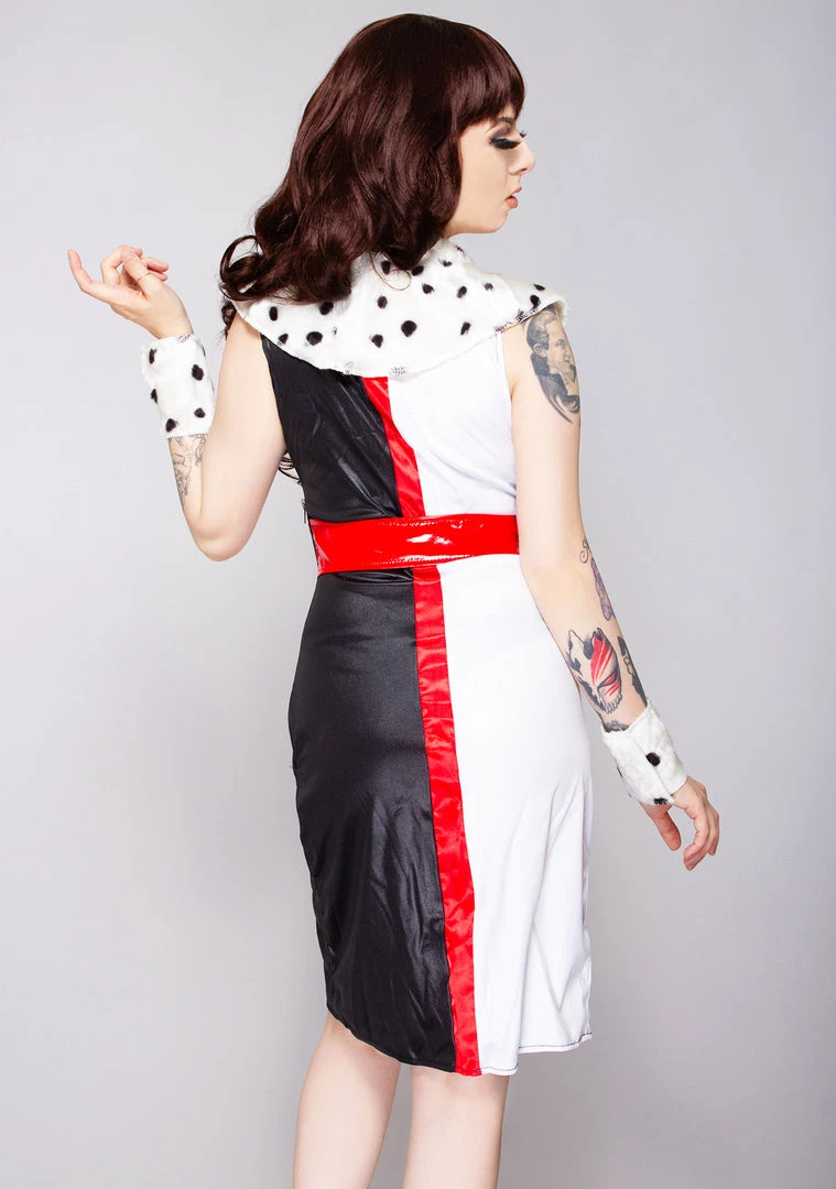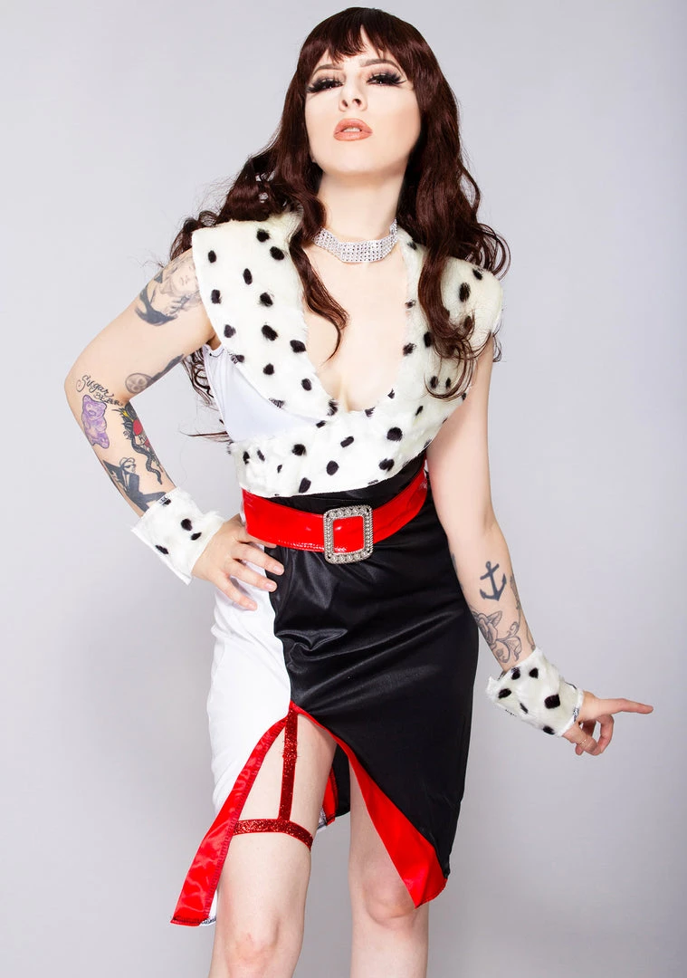 They better beware of you in the Devilish De Vil 3PC set from Leg Avenue. This fashionably sultry set features a dalmatian spotted faux fur-trimmed wrap dress with a thigh-high slit and attached red garter and like any perfect ensemble, this set is complete with an attached devilishly red belt, dalmatian spotted faux fur cuffs, and shimmering choker. Because looking good is always better than being good and you look fabulous dahling.