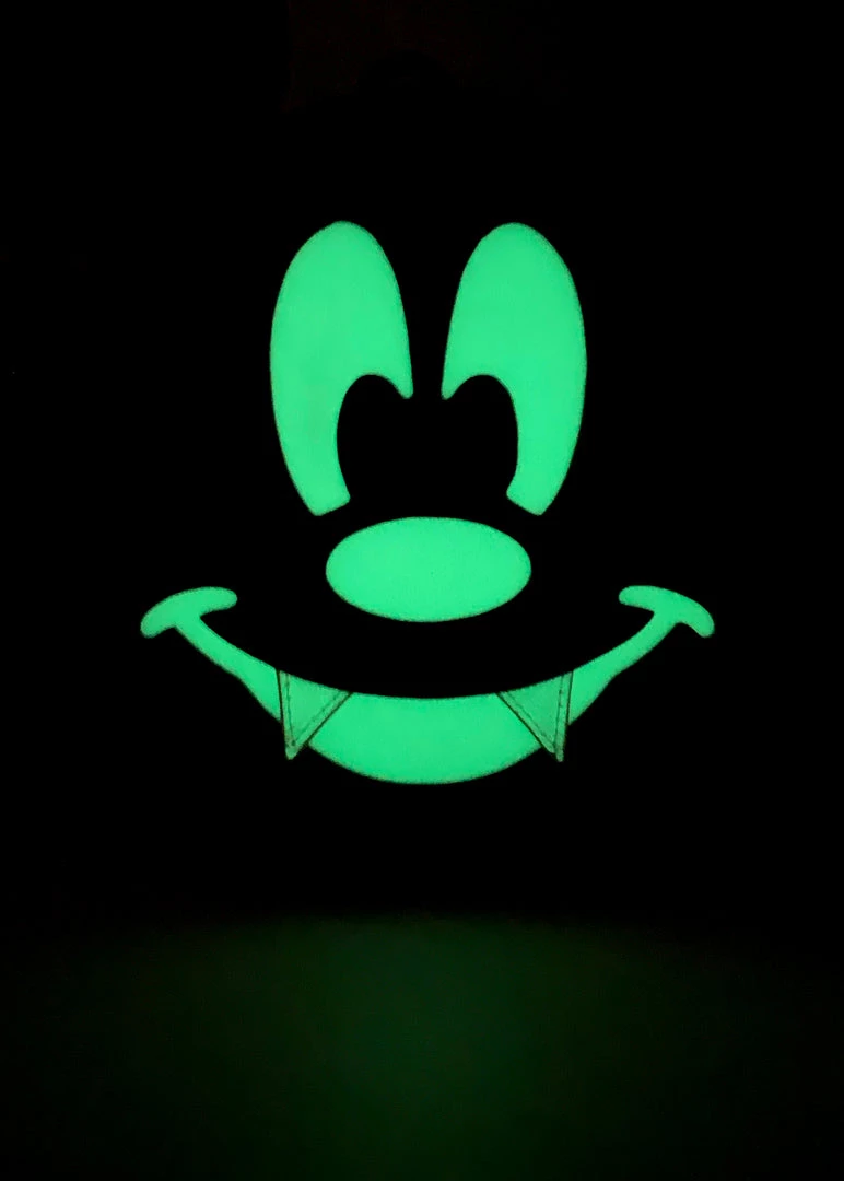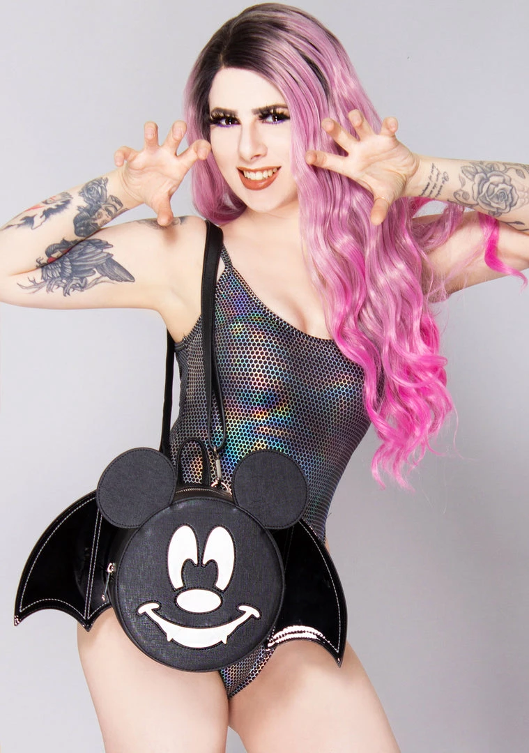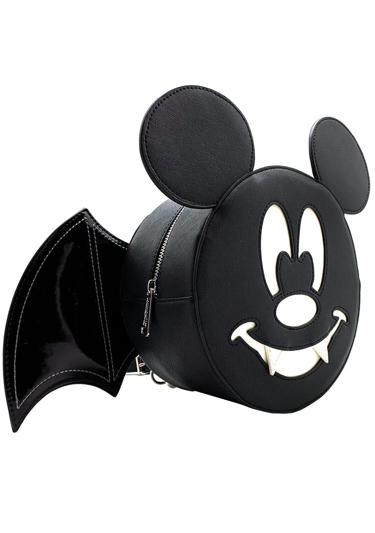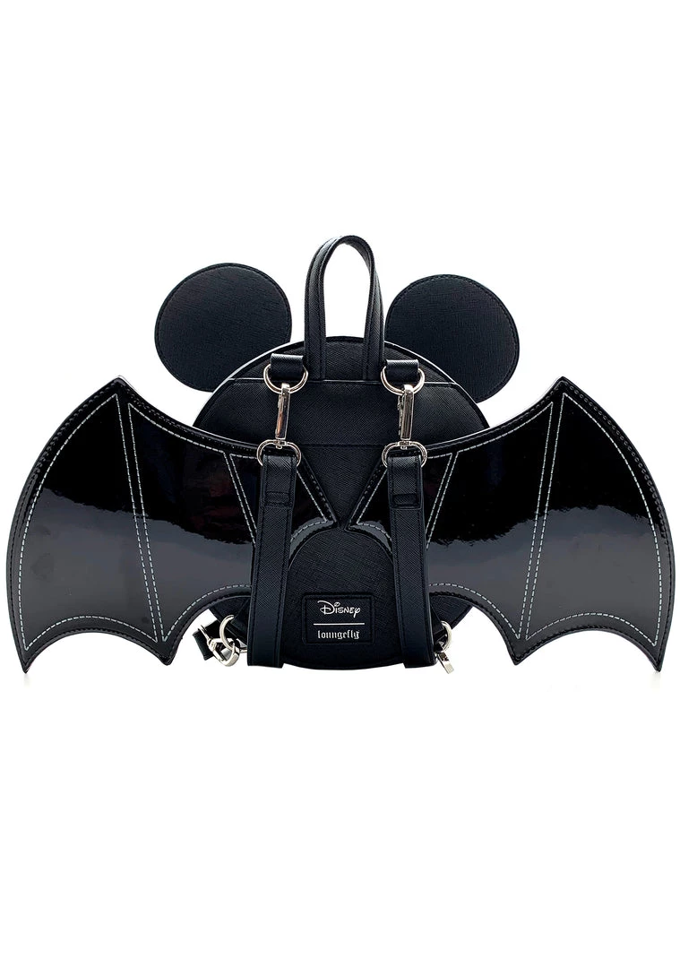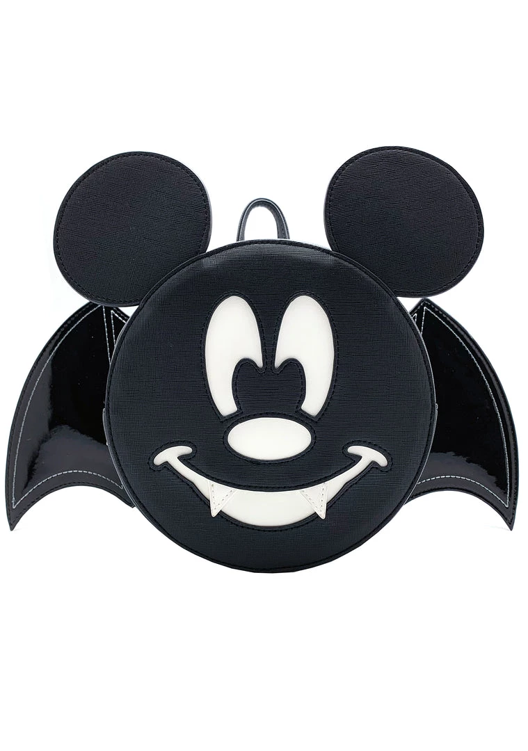 Fly above the radar, Disney style, in this batty Loungefly X Disney LASR Exclusive Mickey Bat Convertible Mini Backpack. Made with Saffiano textured vegan leather and patent leather wings that swivel, this Loungefly mini backpack is Disney not-so-scary Halloween vibes and features a sleek black exterior with super cute black batwing details paired with a friendly mickey glow-in-the-dark vampire smile for any Disney daredevil! Finishing with a crossbody strap and dual adjustable buckle straps, bat your lashes, and this Halloween Loungefly Mickey Mouse mini backpack might be sold out!