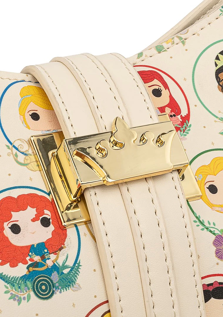 Grab your crown and head out with the Disney Princess POP Circles Crossbody Bag from Loungefly. This cute festival crossbody bag features a vegan leather outer printed with Disney princesses, zipper closure, closure strap detail with a gold metal crown accent, and an adjustable removable crossbody strap. This bag is made for royals only.