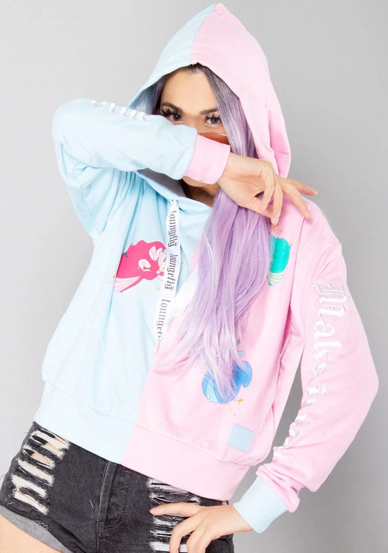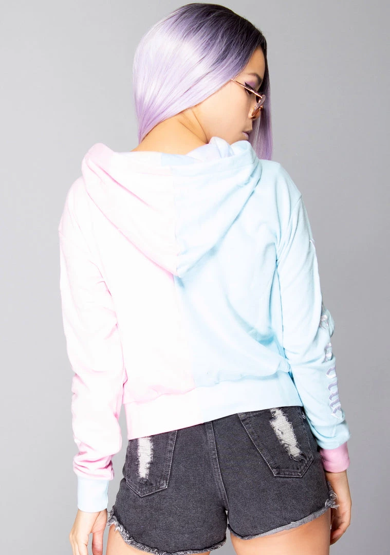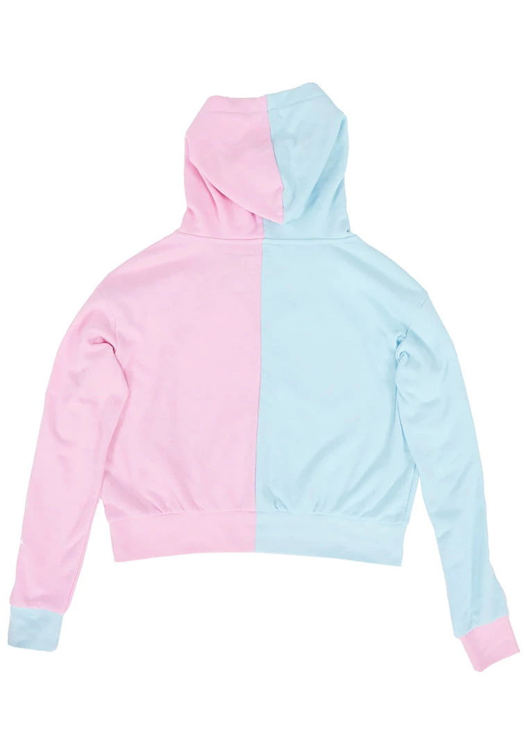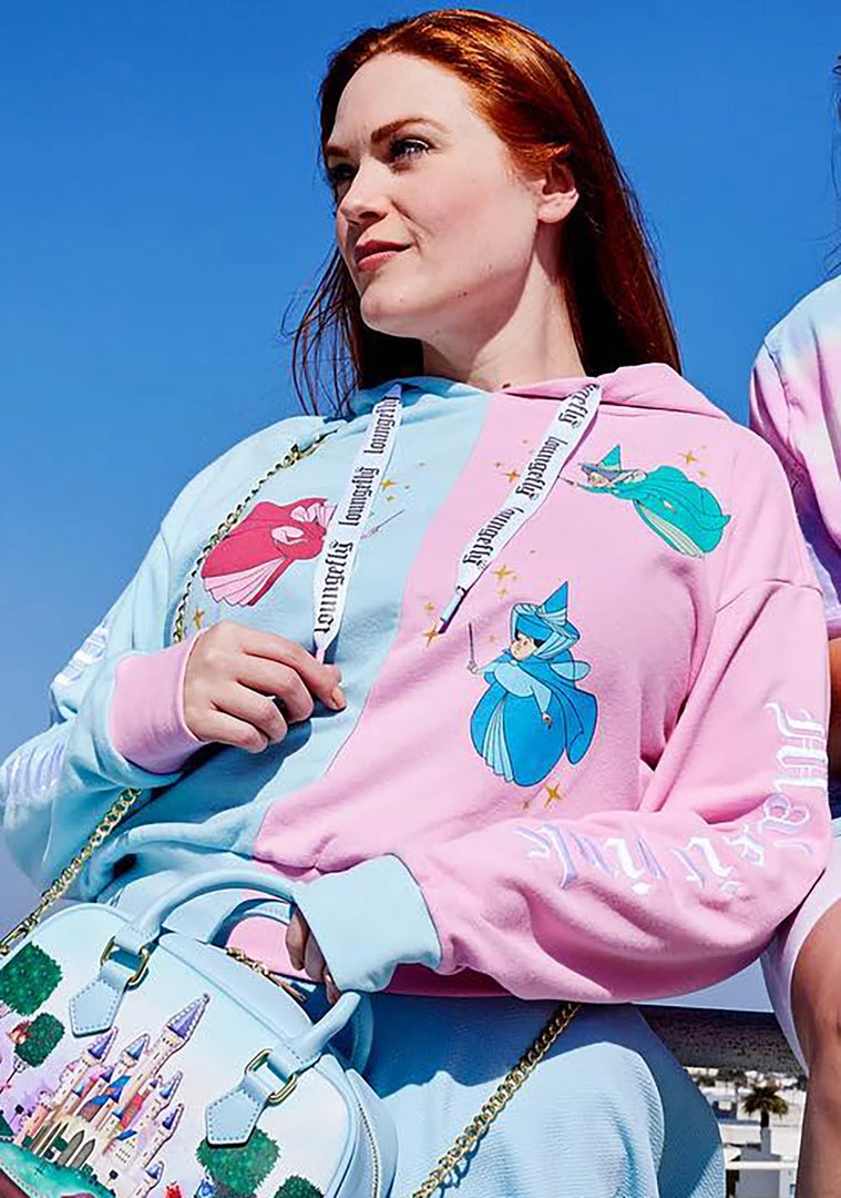 The Disney Sleeping Beauty Make it Pink Blue Crop Hoodie from Loungefly is a fairytale dream come true! This magically cute festival hoodie features the dynamic trio Flora, Fauna, and Merryweather screen printed on half pink, half blue, french terry material with the words “make it pink” and “make it blue” embroidered on sleeves, tie-dye jersey-lined hood, and Loungefly logo drawstrings. Who said you can’t have the best of both?