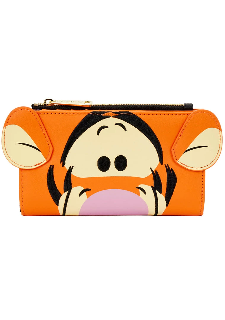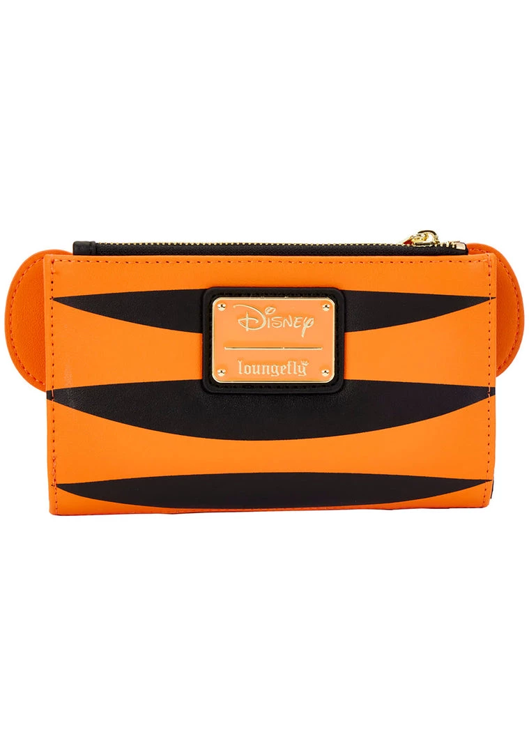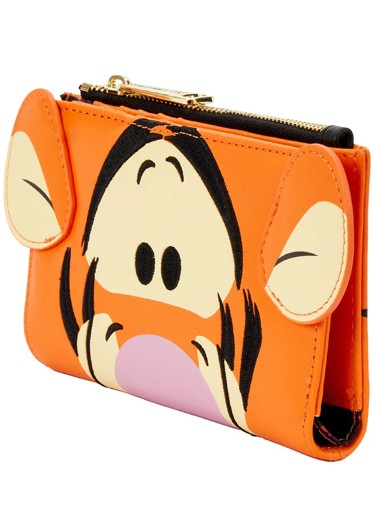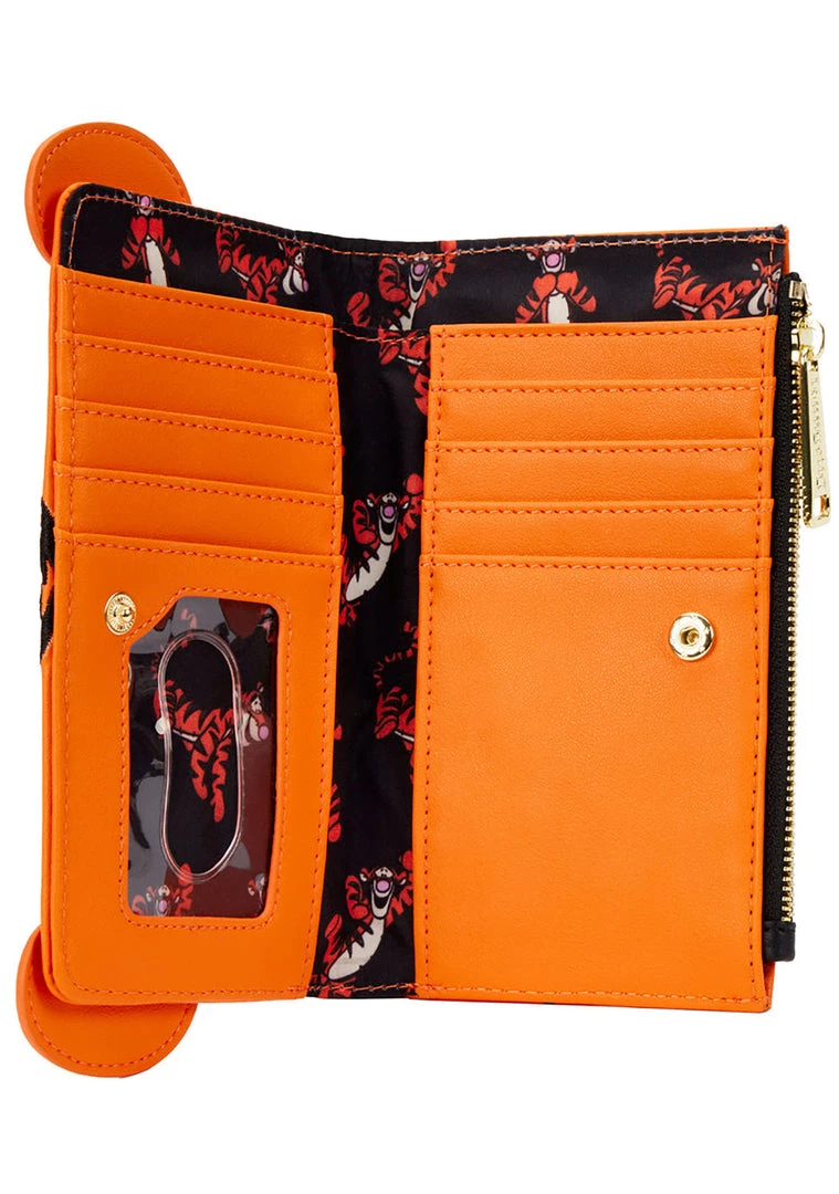 Fill your heart with joy while carrying the Disney Winnie The Pooh Tigger Cosplay Wallet from Loungefly. This bouncy cute wallet features a Tigger face applique on an orange vegan leather base with printed tiger stripes, interior card slots, an I.D. window, an inner coin pocket, gold metal hardware, and snap closure. Just remember “Tiggers don’t jump, they bounce!”