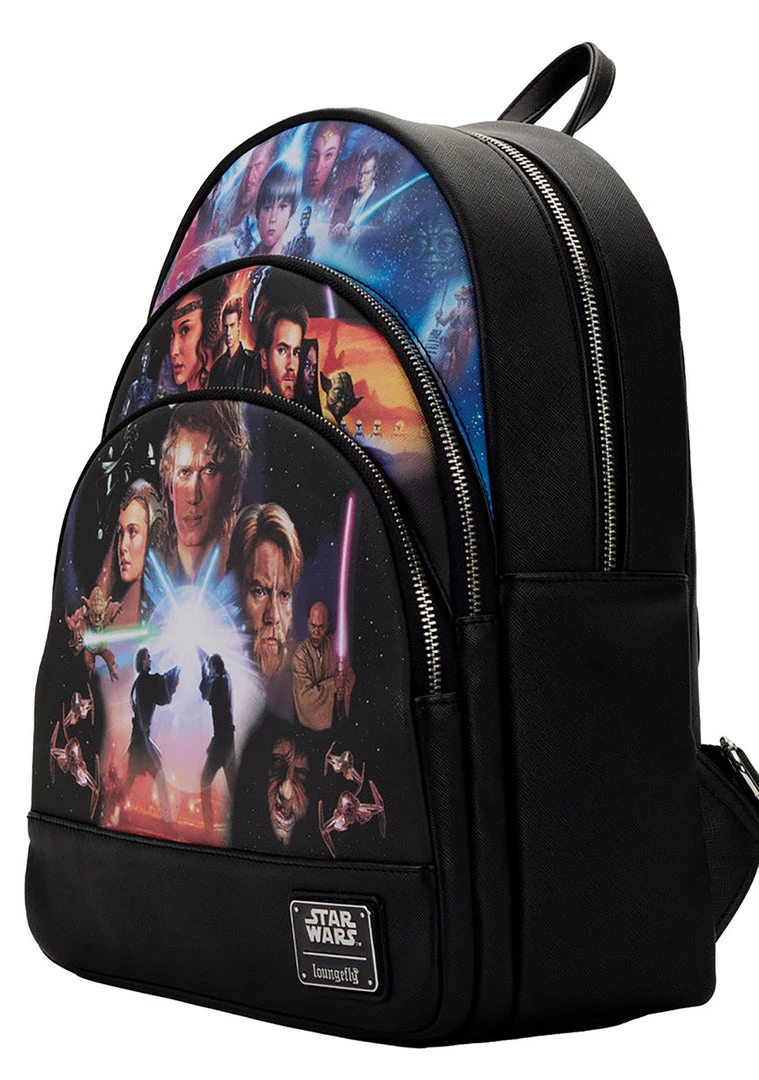 Go back to where it all began with the Star Wars Prequel Trilogy Mini Backpack from Loungefly. This epic festival bag features a vegan leather outer printed with the most iconic scenes throughout the trilogy, two zipped exterior pockets, a top handle, zip-top closure, and adjustable straps. With this cute backpack, you will have the high ground!