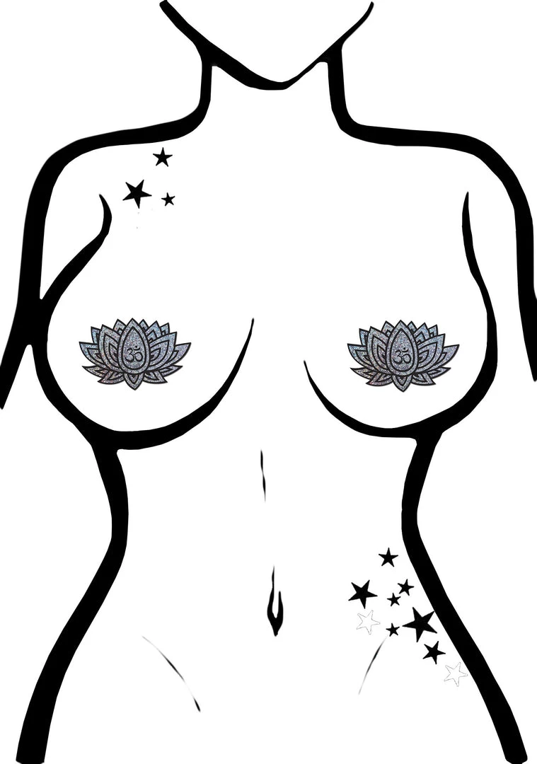 Cover up or bare it all when you wear the a pair of super cute Glitter Ohm Lotus Nipple Pasties Covers by Pastease. These can be worn as or with any festival tops, and are made with latex-free, medical-grade, waterproof adhesive that are sure to stay in place until you take them off. Just peel off the backing, apply to clean & dry skin and get ready to dance your tits off, but not your pasties!