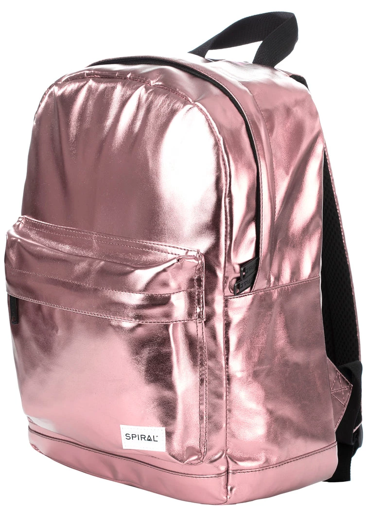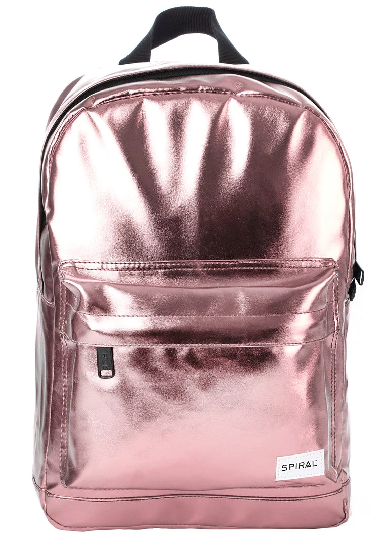 Rose Gold Rush Festival Backpack by Spiral UK, ‘cuz everything you touch turns to gold! Blind the haters in this metallic backpack made of hardwearing premium fabrics, reinforced, adjustable back straps. Additional back padding, spacious front pocket, media port, grab handle, and custom logo labeling. 18L capacity with inner laptop/book divider, pen/pencil organizer, and spiral branded inner lining. They’ll be sure to catch the fever.