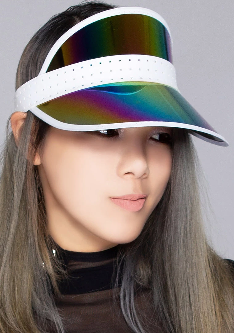Rage like no other when partying in the Midnight Iridescent Retro Sun Visor from Sunnylife. This gotta-have festival hats features a full on purple/multi iridescent translucent color, contrast with white vegan leather trimmings, made with PVC base, and an elasticated back for comfy fit. This screams PARTY VIBES!