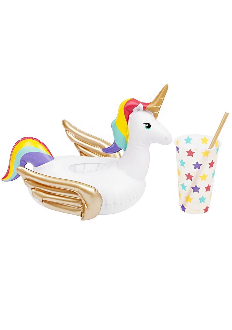 Get your drink on with the Party Wonderland Inflatable Drink Holders by Sunnylife. Made for two, it features two drink holders, two straws, and two cups with rainbow stars all over. A magical unicorn and star pillow keep your drinks afloat. Perfect for sippin’ poolside, it’s made with non-toxic PVC. Includes repair patch. Do it for the ‘gram!