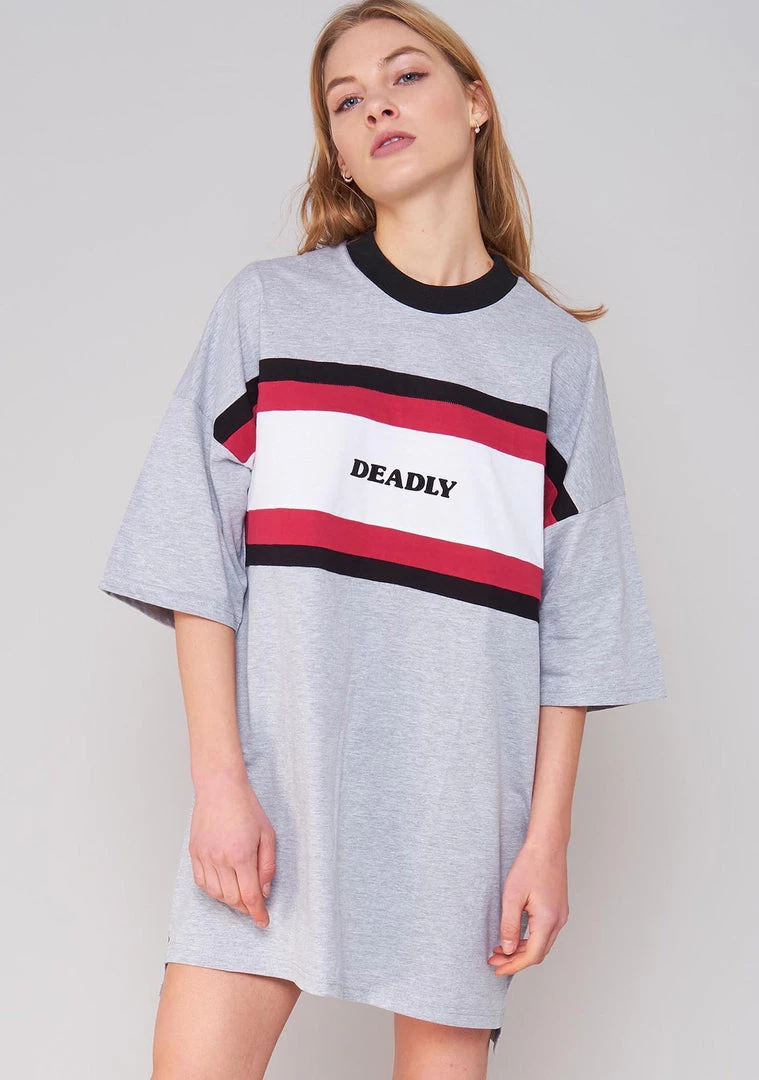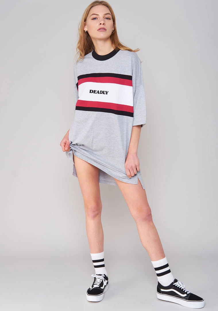 Talk sh*t, get hit. Let ’em know you’re not the one to mess with when you wear this Tough Girl Dress from The Ragged Priest. This super cute t shirt style festival dress comes in a soft cotton blend for an oversized relaxed fit, sports stripe with “Deadly” slogan on front, short sleeves and scoop neckline.