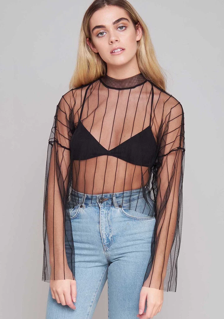 Rest in peace to boring style when you wear the Widow Mesh Top from The Ragged Priest. This super cute festival tops comes in a polyester sheer mesh cropped style with pinstripe detail, long sleeves, and mini turtle neckline.