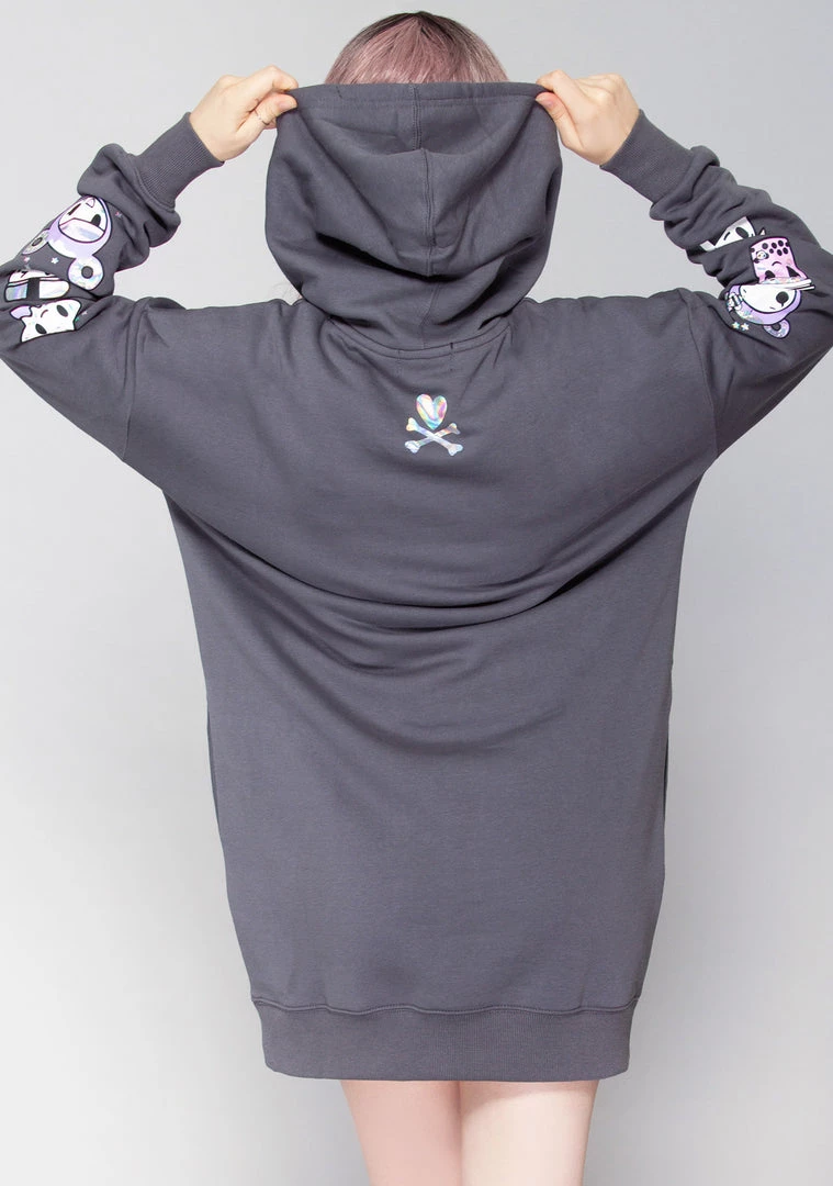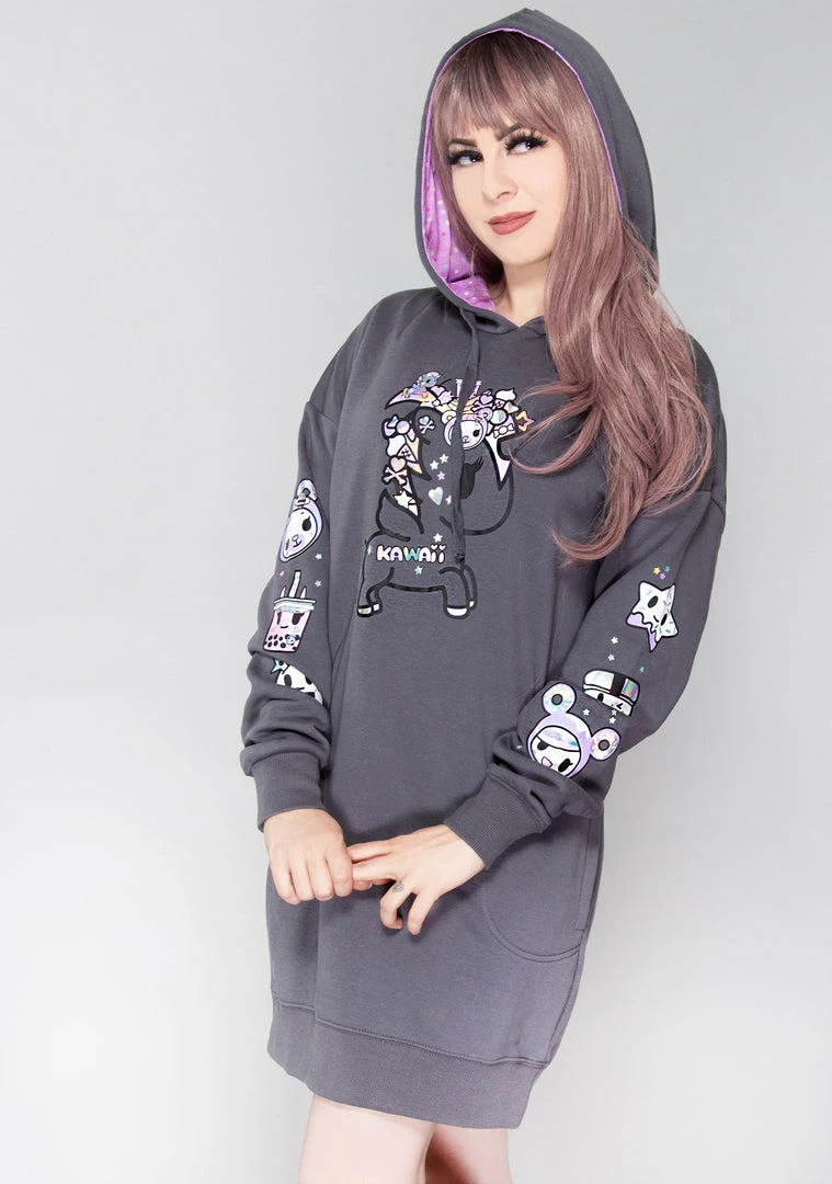 Dance through the night with the Midnight Tokimeki Hoodie Dress from tokidoki. This cute festival dress features a gray long-sleeve knee-length fleece with printed and foiled details, an attached hood, and a front pocket. #SweetDreams