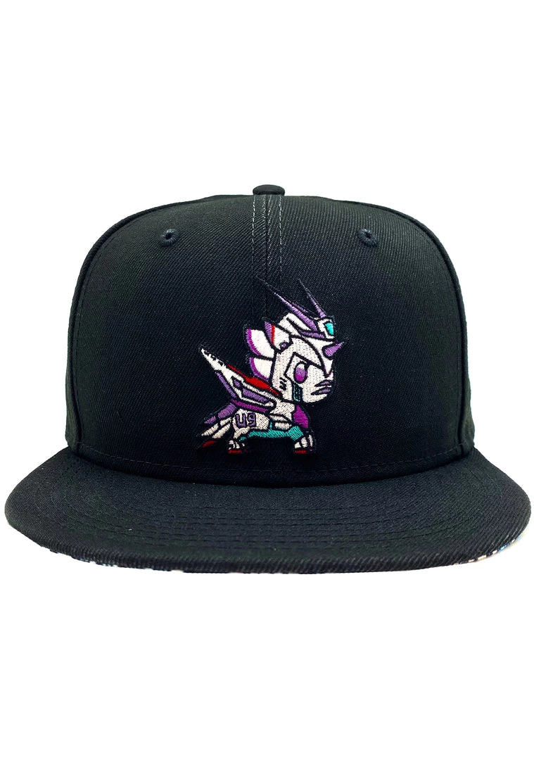 Suit up for battle with the Mekacorno U9 Snapback Hat from tokidoki. This high-tech festival hat features an all-black hat with Mekacorno embroidered on the front, printed under-bill, and an adjustable snapback fit. The future is now!
