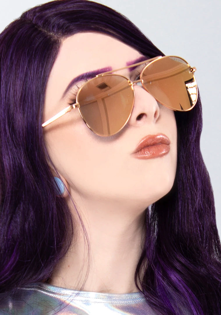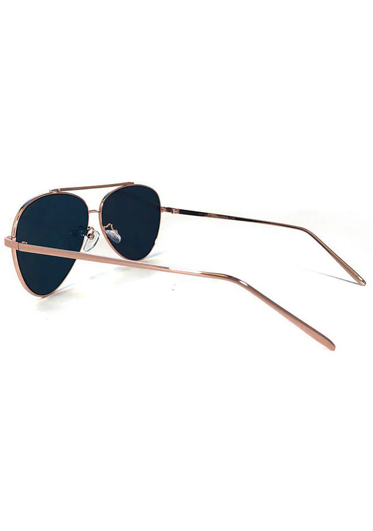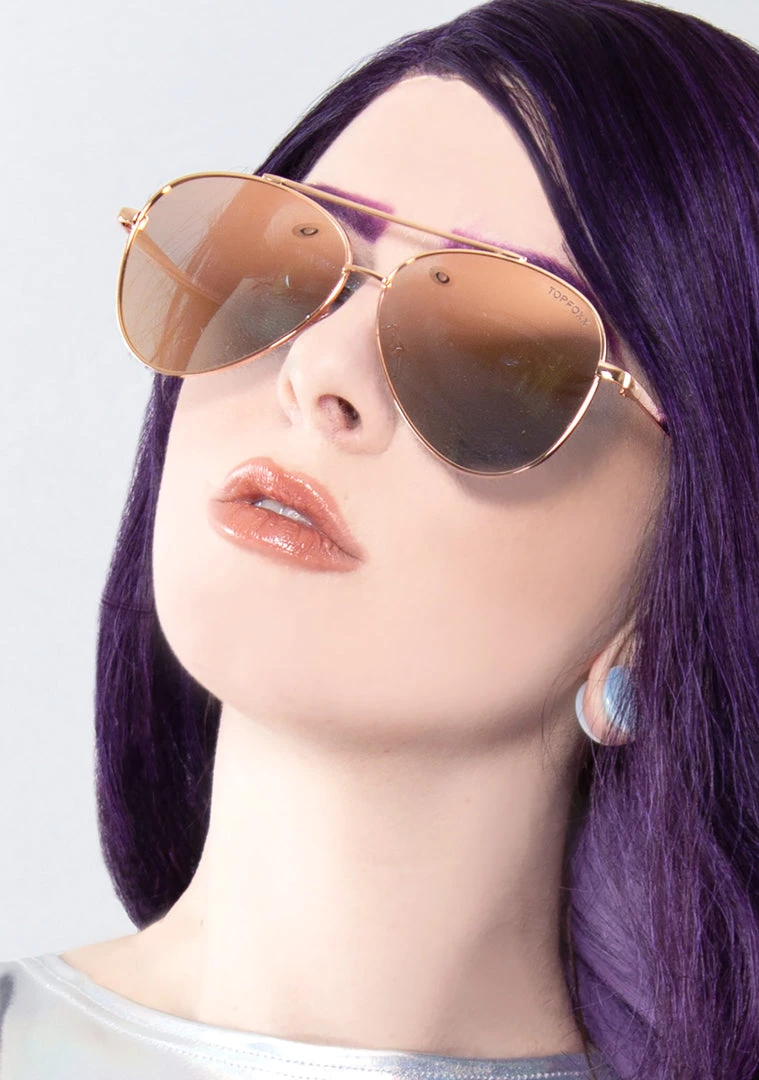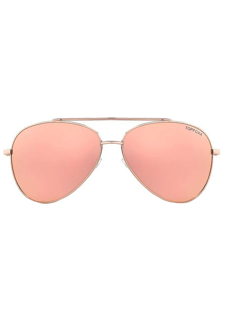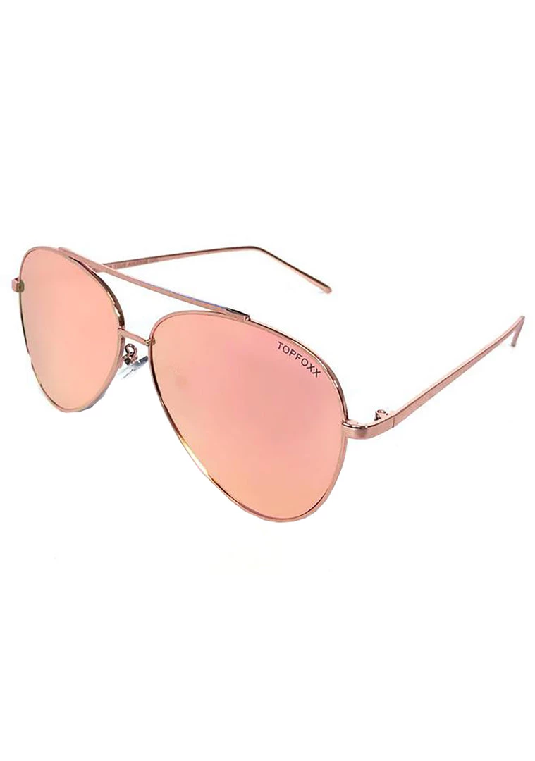Up your summer accessories with the Amelia Rose Gold Sunglasses from Topfoxx. These golden festival sunglasses features a shiny rose gold metal aviator frame with comfy nose padding, and matching rose gold mirrored lenses. A must-haves for any girl boss out there.
