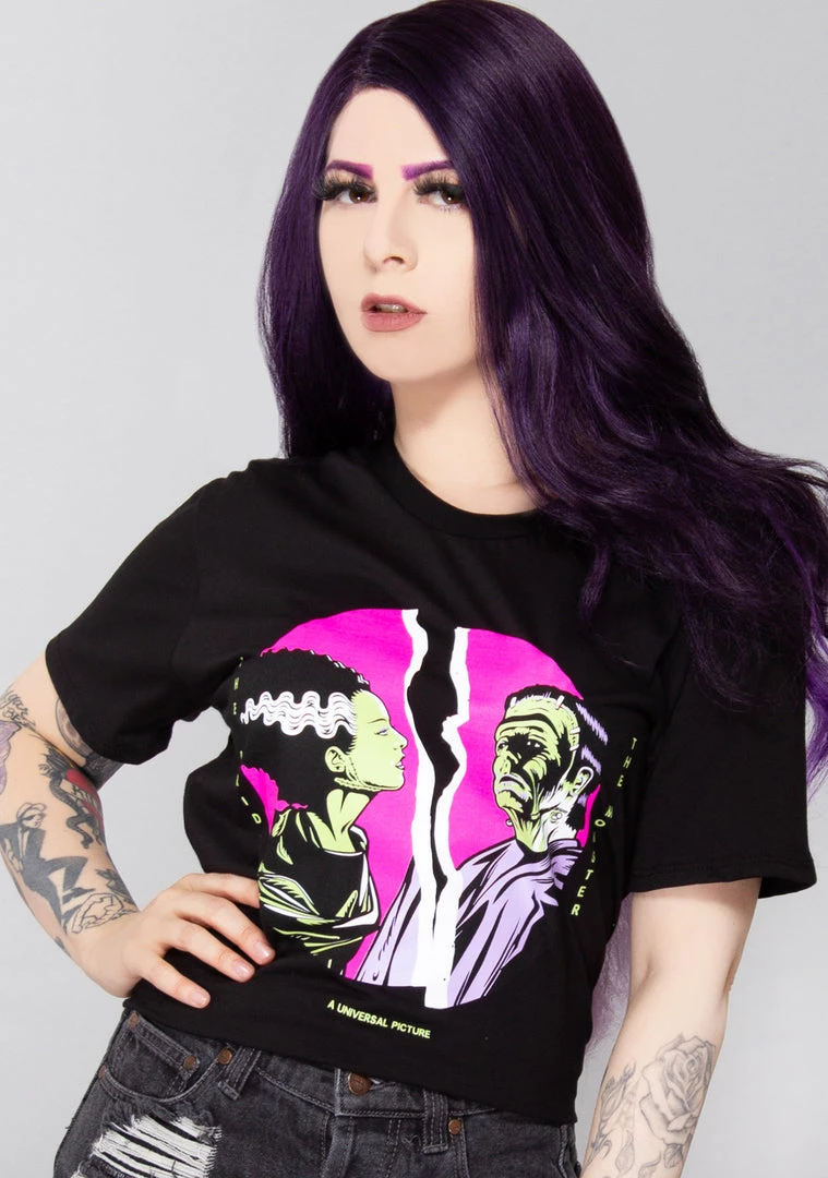 Find someone just as creepy as you in the Universal Monsters The Bride & The Monster Tee from Unique Vintage. This monstrously cute rave t-shirt features a black short sleeve tee with a printed graphic on the front. If Frankenstein’s Monster can find love so can you!