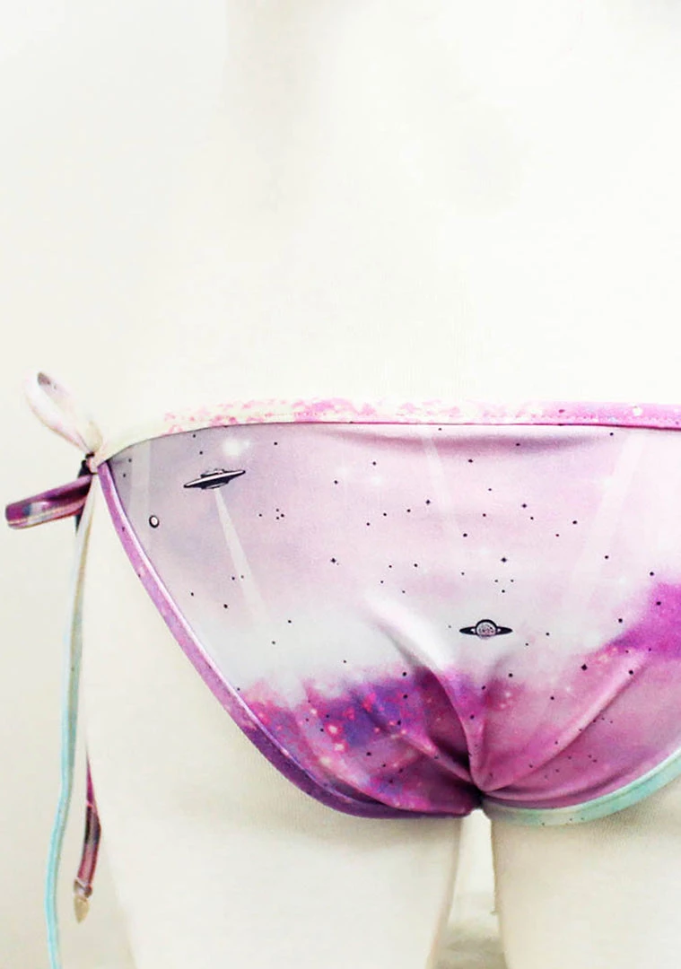 Star gazing with the Star Cadet suit on the beach. The Wildfox Festival Swimwear Star Cadet Reversible Classic String Bikini top feature a low-rise waist, string ties at the hips. Ties finished with gold Wildfox charms. Galactic UFO inspired print reverses to stewardess blue on shiny polyester spandex blend.