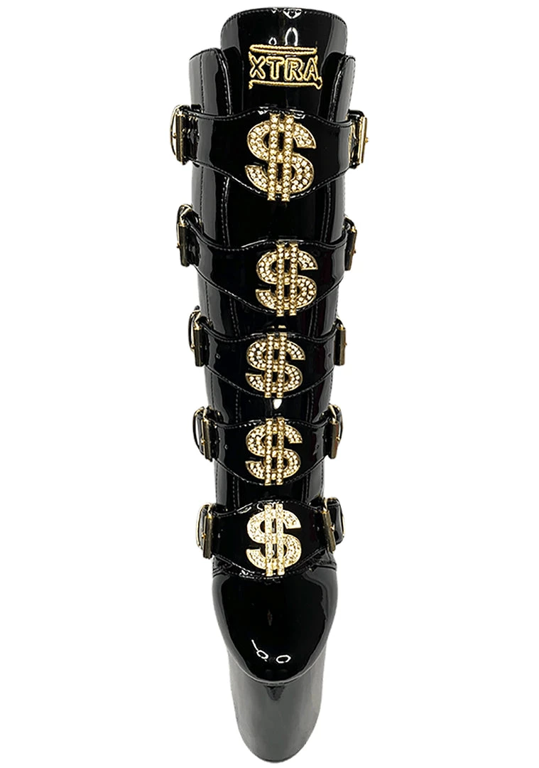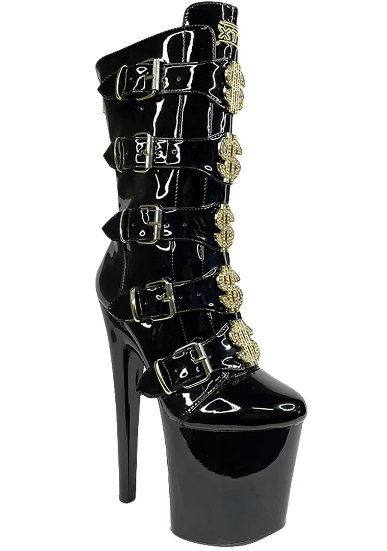They’ll make it rain when you wear the VIP Platform Heel in Black Gold from YRU! These totally hot platform heels feature an all-black vegan patent leather outer, 5 buckled straps up the front with gold-tone hardware, blinged our enamel dollar sign details, sky-high platform heel, zipper closure up the back, and ‘Tip Me’ printed rubber outsole. With these cute boots, they’ll be wanting you in a room all to themselves.