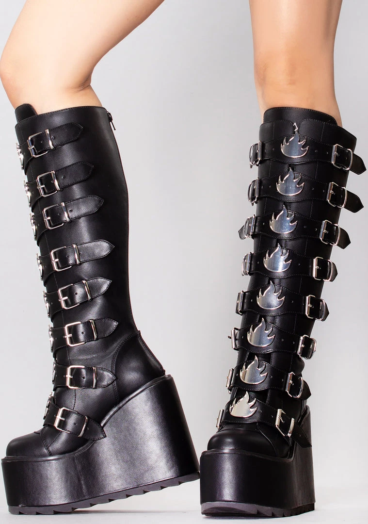 Make your outfit hotter than hell with the Dune Hi Flame Platform Boots from YRU. These bada$$ festival boots feature an all-black vegan leather upper, buckle upfront with enamel flame detail, and zipper closure up the back. These boots are almost too hot to handle.