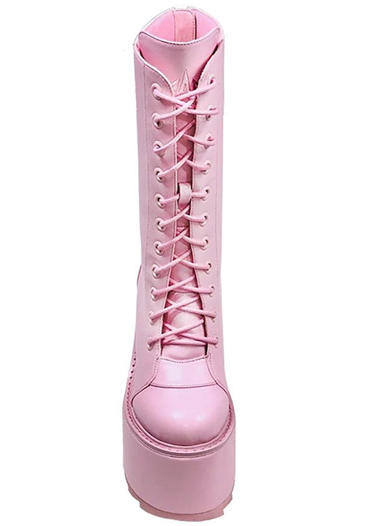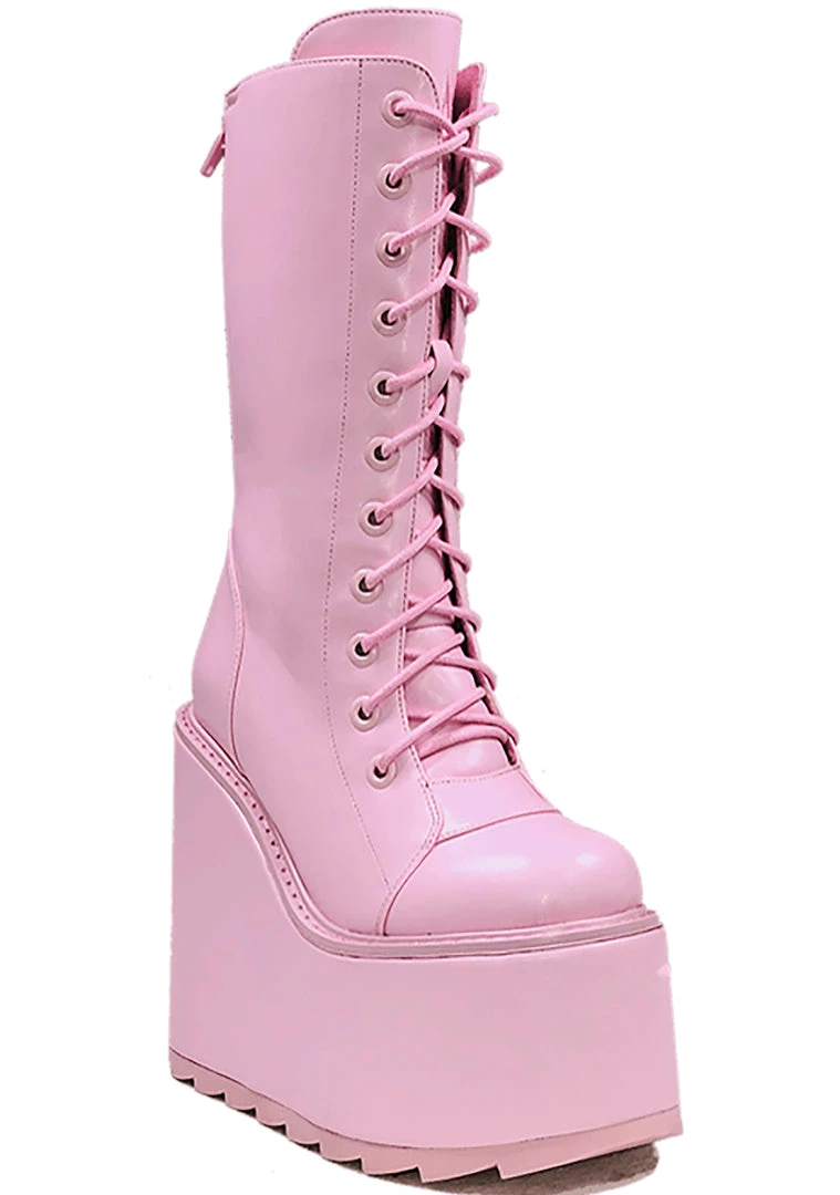Be a punk rock pastel princess in the Dune Lace Up Platform Boots in Baby Pink from YRU. These killer cute festival boots feature an all pink vegan leather upper and wrapped sole, lace up front, and zipper closure up the back. Throw on these cute boots and party like a princess and kick a little a$$!