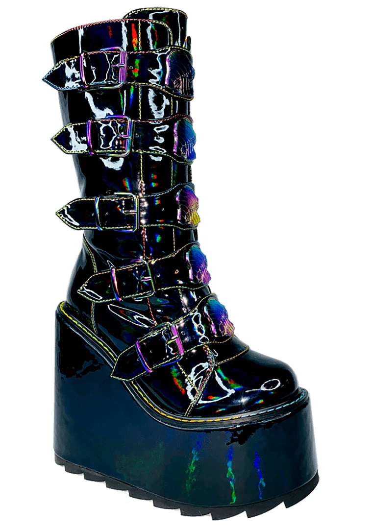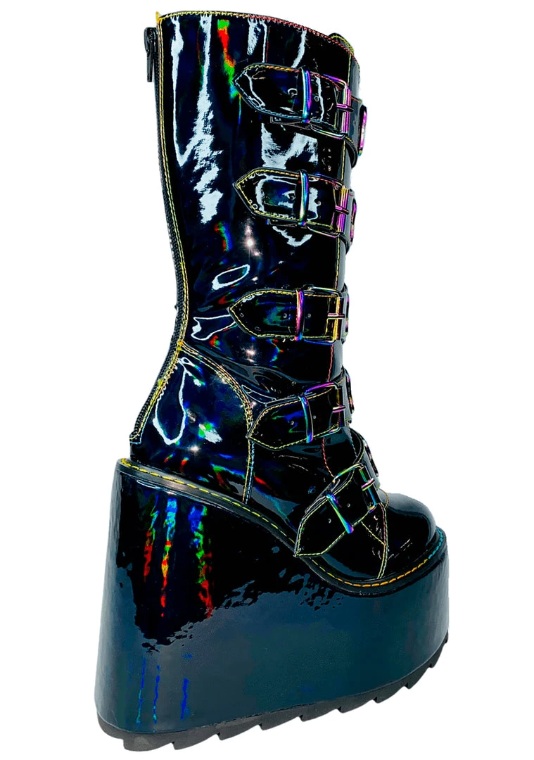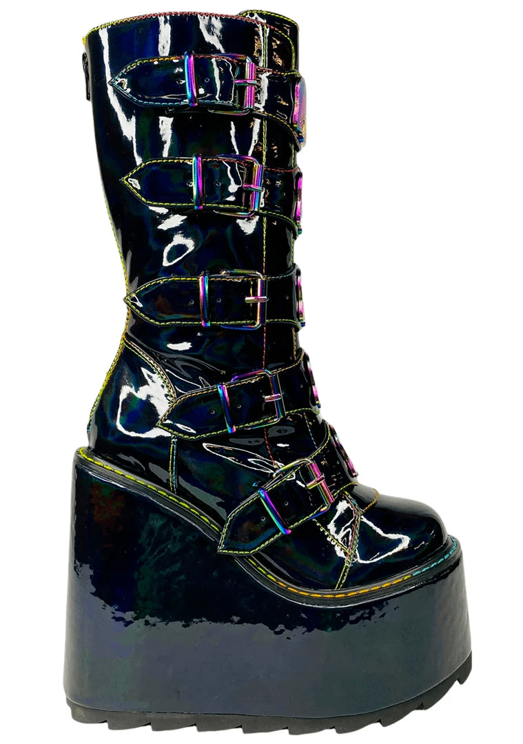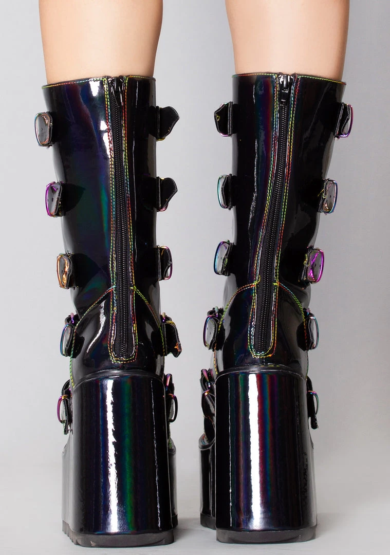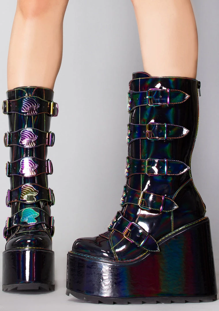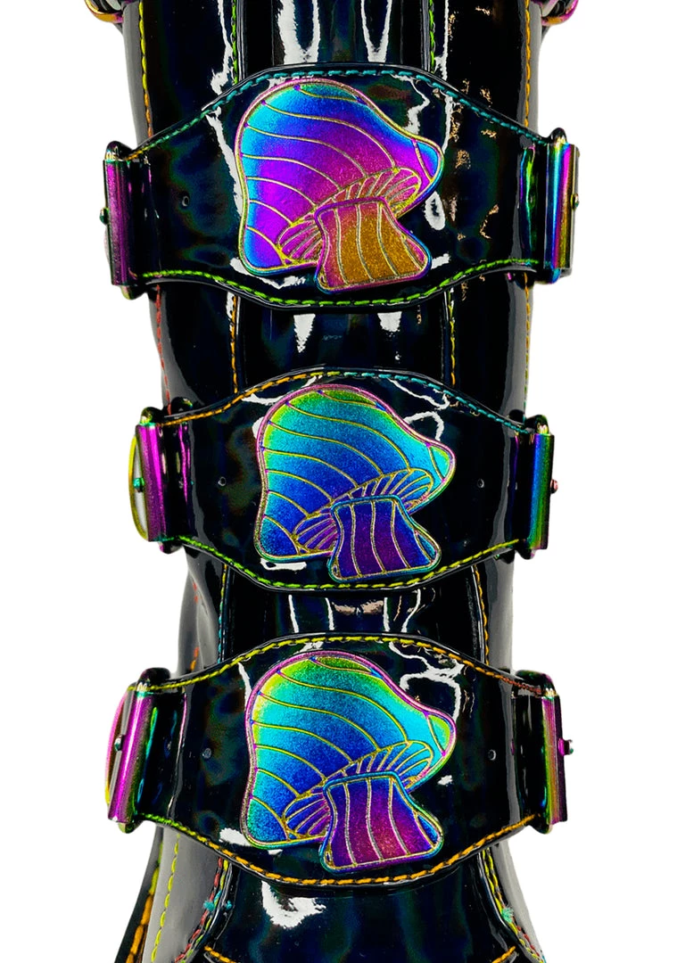 Take a journey from this world into the next in the Dune Mushroom Platform Boots in Black Multicolor by YRU! This super-fun festival boot features a vegan holographic black patent leather outer, back zipper closure, front buckles, and enamel mushroom details. Rock these boots at your next rave and have an out-of-body experience!