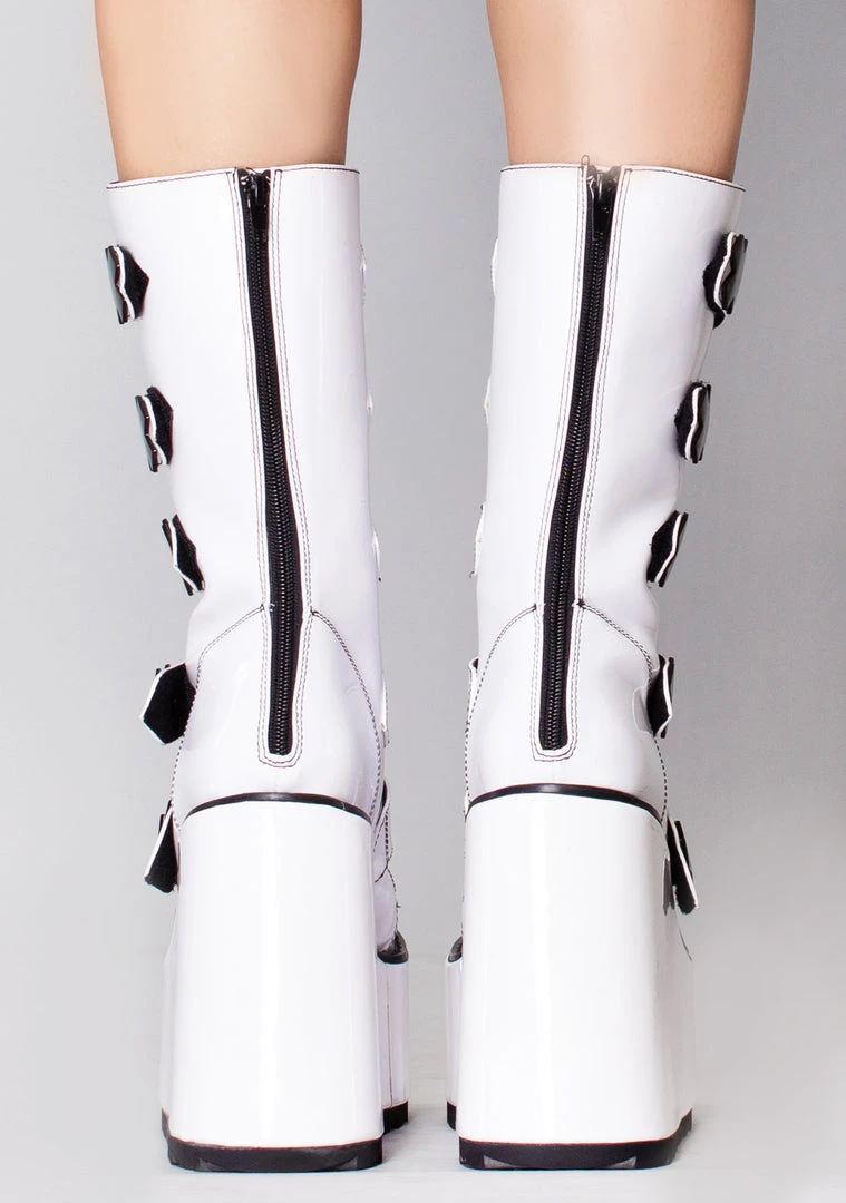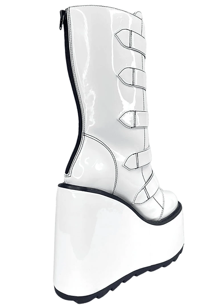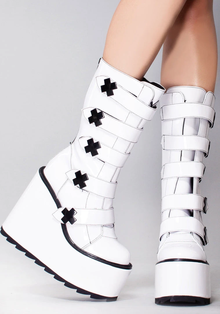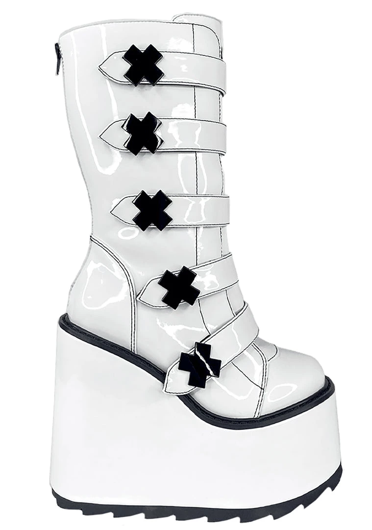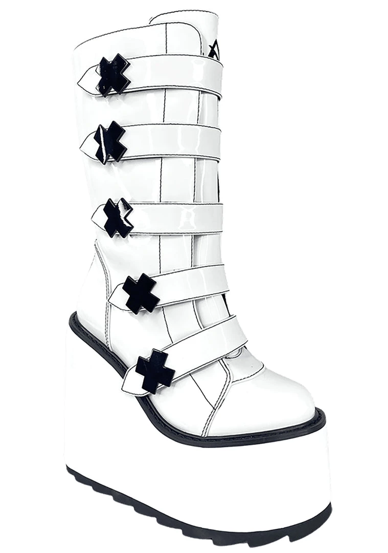 Be an intergalactic space soldier at your next rave with the Dune Strapped X Platform Boots in Storm TT by YRU! These awesome festival boots feature a white patent leather outer, a velcro strap closure, back zipper, black rubber trim and stitching details, black enamel X charm details, and platform wedge heels. With these cool shoes, you’ll rule the universe!