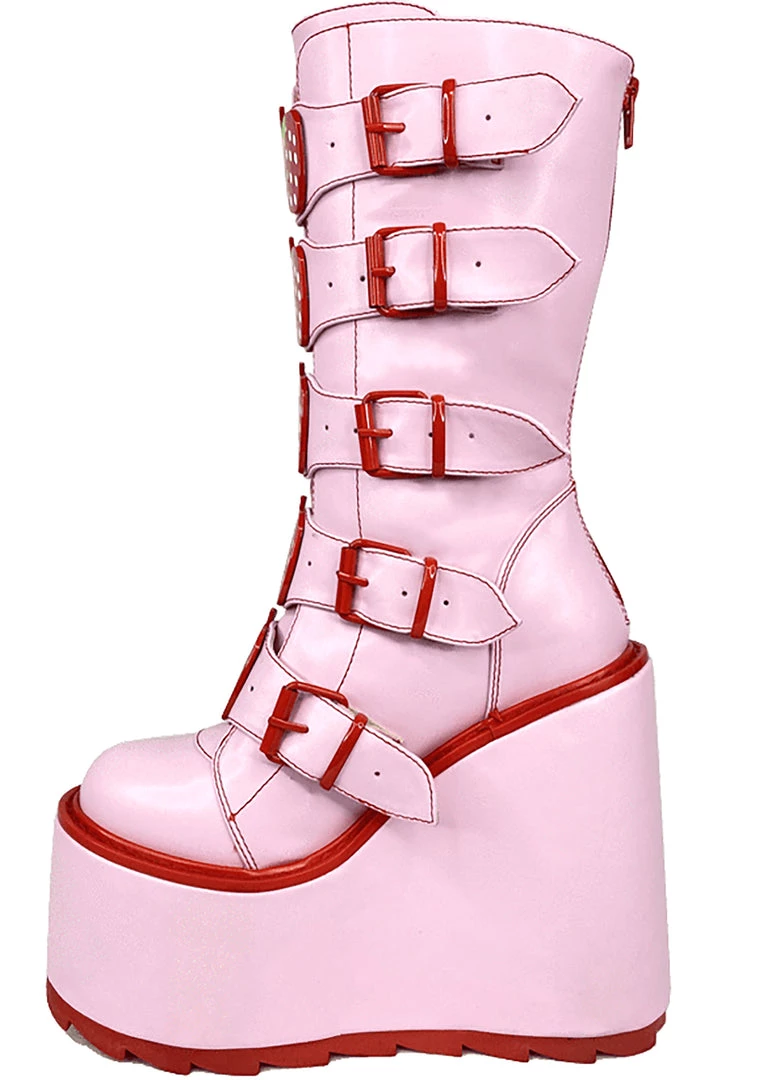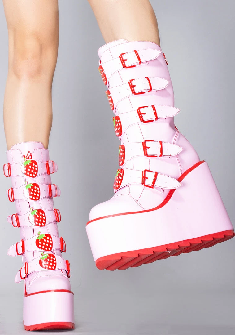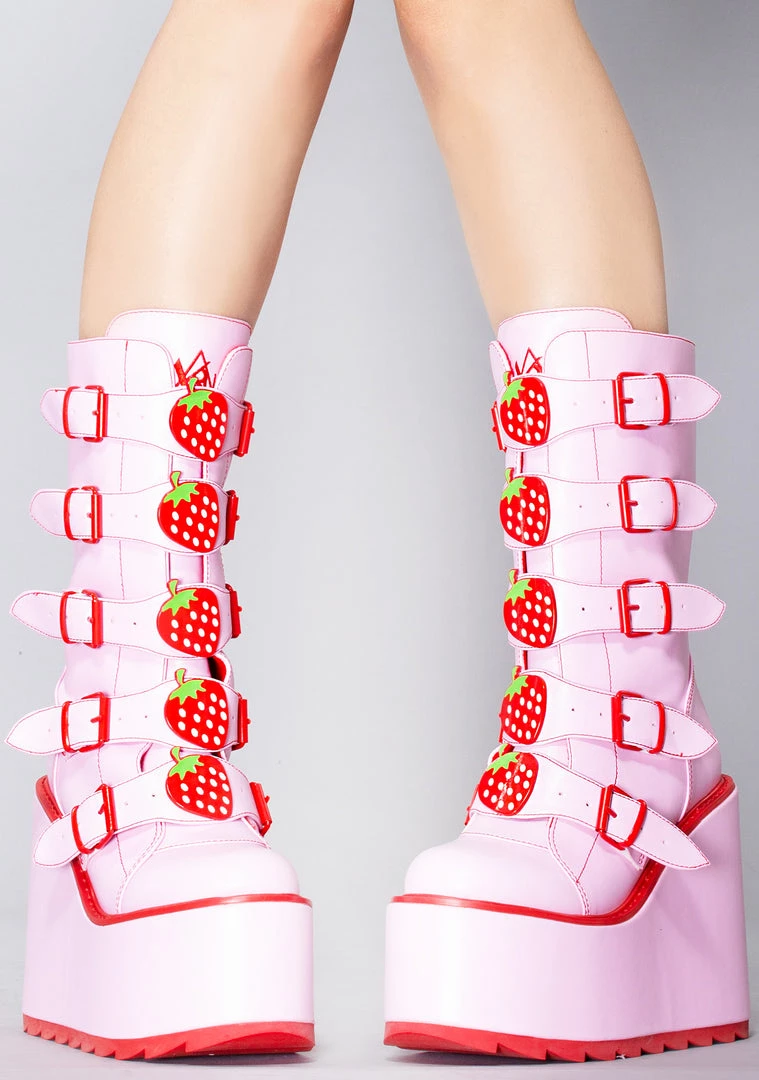 Look like a delicious treat in the Dune Strawberry Platform Boots in Pink Red from YRU. These super cute festival boots feature an all pink vegan leather upper with red trim, buckle upfront, enamel strawberry details, and zipper closure up the back. Just a taste of you with these boots will leave them craving more.