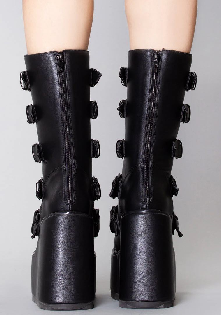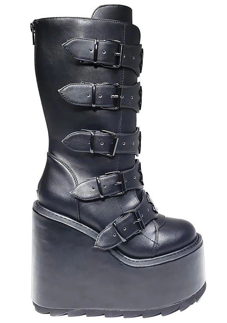 It’s all black all the time with the Dune X Blackout Platform Boots from YRU. These intensely dark festival boots feature an all-black vegan leather upper, buckle up front, black enamel X details, and zipper closure up the back. These totally versatile boots are perfect for any rave outfit!