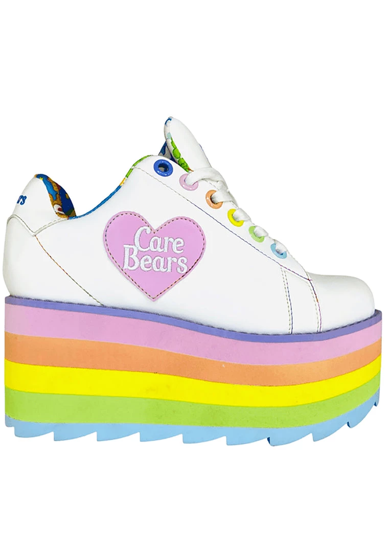 Enter a land of love magic and rainbows while wearing the Care Bears Lala Platform Sneakers in White Pastel from YRU. These magical platform sneakers feature a multicolor vegan leather upper, lace-up front, applique detail, and colored bottom. #CaringIsWhatCounts