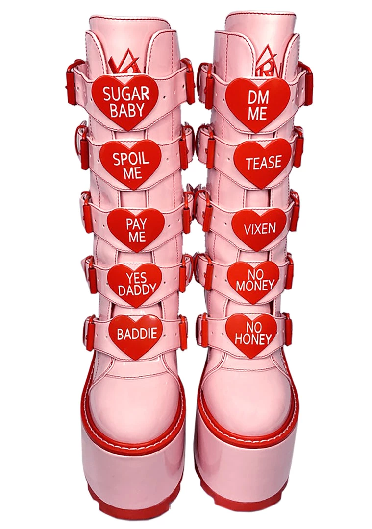 Everyone will want you to be their sweetheart with the Dune Valentine Platform Boots from YRU. These hot festival boots feature a pink patent vegan leather upper, buckle upfront with heart details, red contrast buckle and piping accents, and zip-up back. These boots are so cute it hurts.