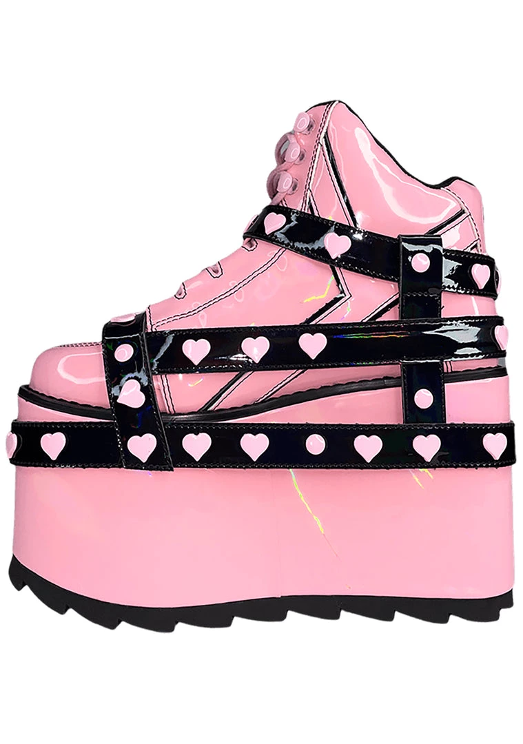 Break hearts with the Qozmo Bondage heart in Black Hologram Pink from YRU. These killer rave platform sneakers feature a holographic pink vegan leather upper, contrasting black colored straps, striking pink enamel heart hardware and a tall pink EVA platform sole.#XOXO