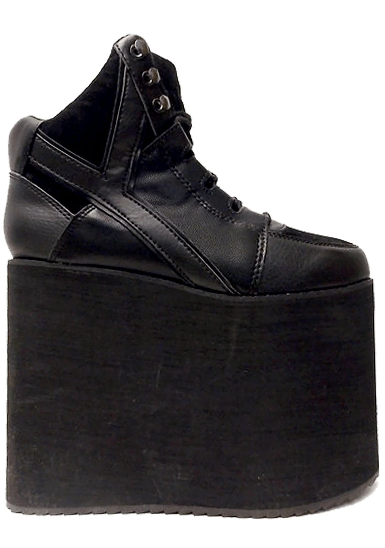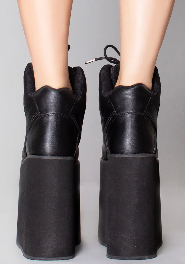 Be above the rest with the Qozmo Sky Hi Platform Sneakers from YRU! These intense platform sneakers feature an all-black vegan leather upper, nylon details, lace up front, and a double-stacked platform sole. With these cute sneakers, they’ll have to get on your level!