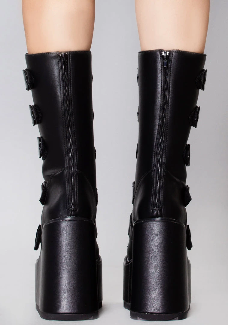 Take your rave outfit to the next level with the Dune Strapped X Platform Boots in Blackout! These super-cool festival boots feature a black vegan leather outer, an adjustable velcro strap closure, back zipper, enamel X charm details, and platform wedge heels. Throw these shoes on at your next event and dance the night away!