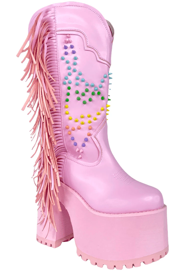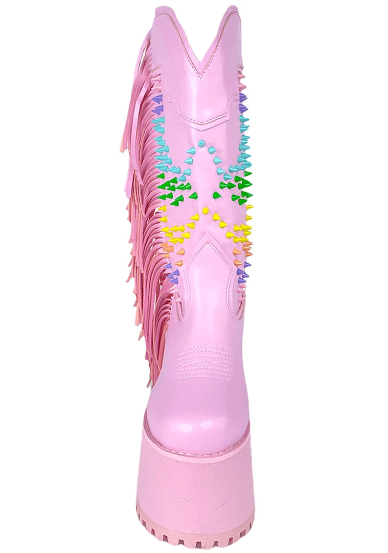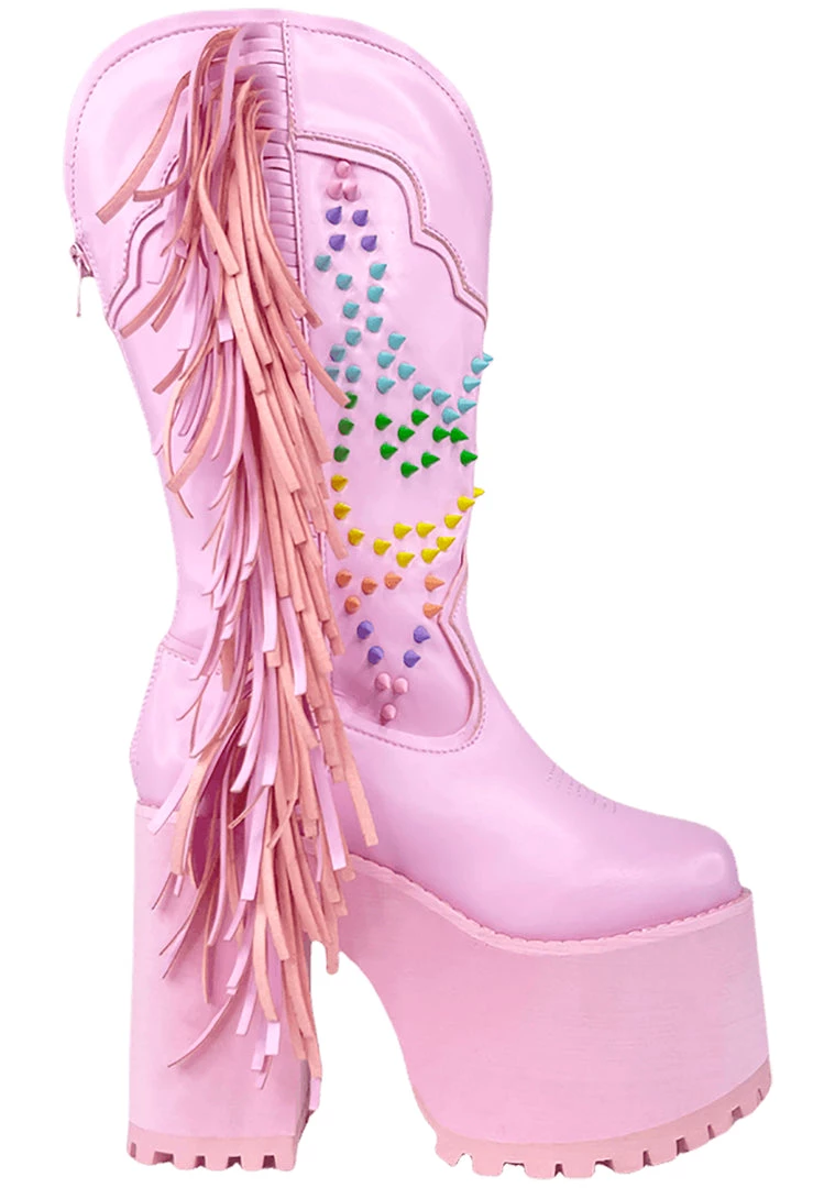 Ditch the rhinestones and be a rock n’ roll cowgirl with the Bad B Fringe Platform Boots from YRU. These awesome festival boots feature an all pink vegan leather upper and wrapped sole, rainbow spike details, fringe accents along the exterior, and zipper closure up the back. These cute boots will have you partying like a rockstar and kicking a little a$$!
